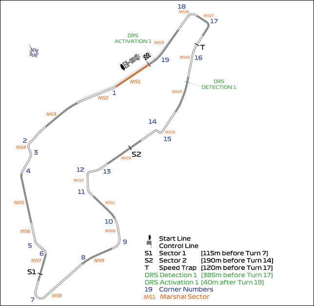 Точка замера интервала между машинами по-прежнему находится за 385 метров до 17-го поворота, а точку активации заднего антикрыла сдвинули – теперь она за 40 метров до 19-го поворота.