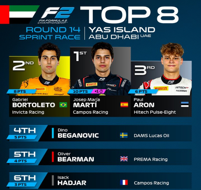Надо также отметить, что в спор Бортолето и Хаджара может вмешаться эстонец Пол Арон, выступающий за Hitech, которому в следующем сезоне предстоит выполнять обязанности резервного гонщика Alpine F1. Он занимает 3-ю строчку личного зачёта, и у него на 25,5 очков меньше, чем у лидера.