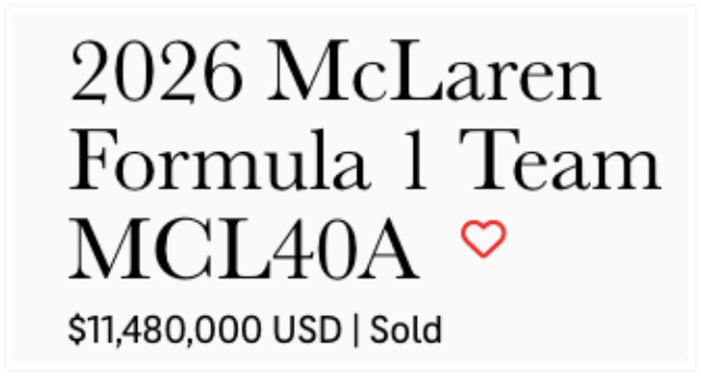 Машина McLaren MCL40A пока не только не выезжала на трассу, но ещё даже не достроена, однако некий коллекционер уже приобрёл её на аукционе RM Sotheby’s почти за $11,5 млн. Точнее, за 11 480 000 долларов.