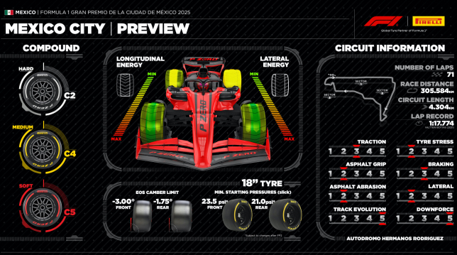 В ходе трёх тренировок командам предстоит тщательно проанализировать поведение на трассе шин Medium и Soft на длинных сериях кругов, чтобы оценить степень их износа. Исторически на трассе автодрома имени братьев Родригес наблюдалось довольно заметное гранулирование резины – в том числе это было связано с тем, что в условиях разреженного воздуха снижается уровень аэродинамического прижима.