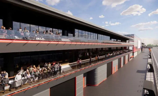 Там располагаются гаражи команд, технические помещения, которые занимает FIA, а также Паддок-клуб. Высота трёхэтажного здания 18,5 м, на первом уровне находятся боксы, и по проекту всего их будет 14 – 11 гаражей займут команды и ещё три будут в распоряжении FIA.