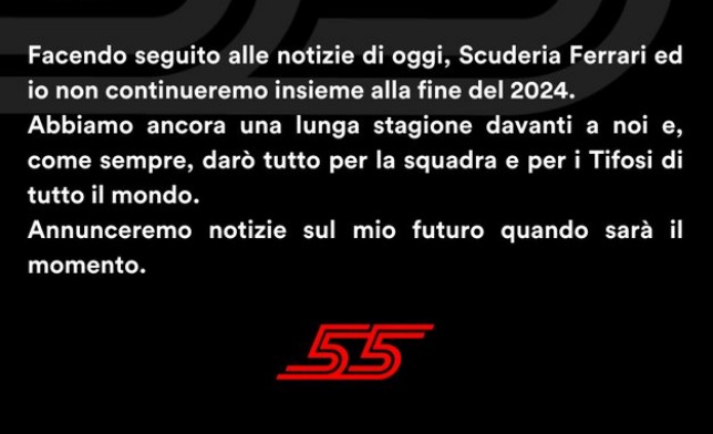 Карлос Сайнс: «В дополнение к сегодняшним новостям сообщаю, что в конце 2024 года наши с Ferrari пути разойдутся. Но впереди ещё долгий сезон, и я, как всегда, сделаю всё, что в моих силах, для команды и для болельщиков Скудерии во всём мире.