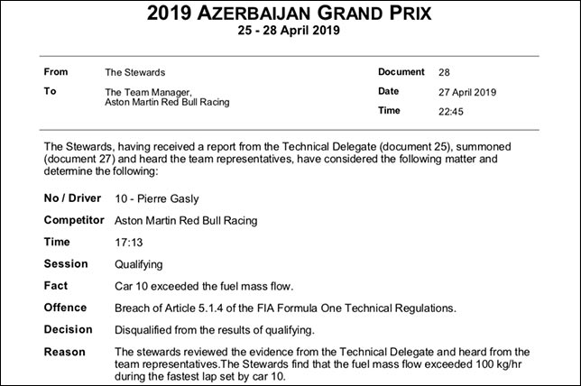 Рассмотрев вопрос нарушения технического регламента на машине Пьера Гасли, когда по ходу быстрого круга в квалификации скорость потока топлива превышала разрешённые...