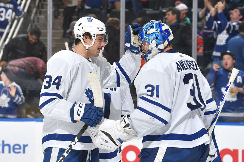 Остон Мэттьюз и Фредерик Андерсен Вратарь Фредерик Андерсен сделал 36 сэйвов и одержал свою 200-ю победу в НХЛ и принес «Торонто»...