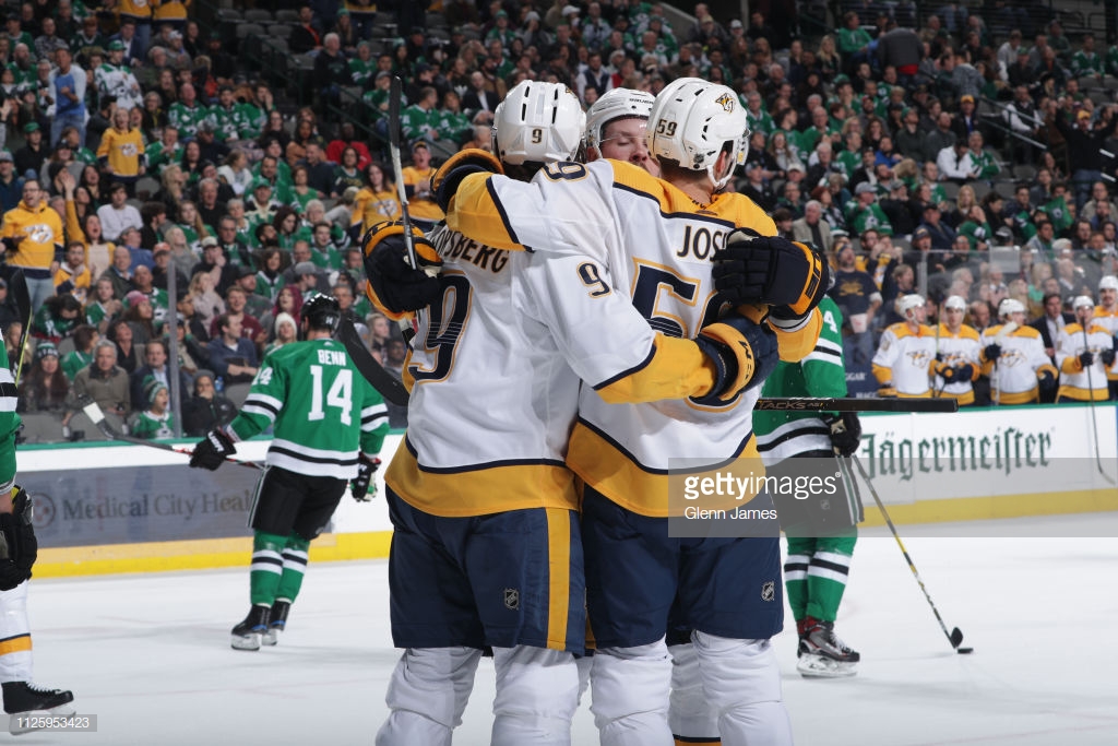 Форсберг и Йоси после заброшенной шайбы «Далласу» Два гола Романа Йоси в третьем периоде при счете 3:3 принесли «Нэшвиллу» (35-22-5) победу,...