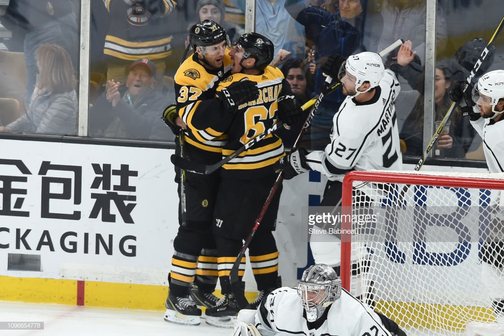 Патрис Бержерон и Брэд Маршанд в матче с «Лос-Анджелесом» Патрис Бержерон провел 1000-й матч в лиге во вторник, но поздравляли его...