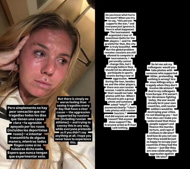 Турнир организовал для игроков экскурсию по центру Кито — и я благодарна за это, город действительно красивый. Но глобальная проблема остаётся: россиянам всё ещё разрешают участвовать в турнирах. Лично я не могу это изменить, но я твёрдо верю, что им не должно быть позволено принимать участие в спортивных соревнованиях во время войны агрессии.